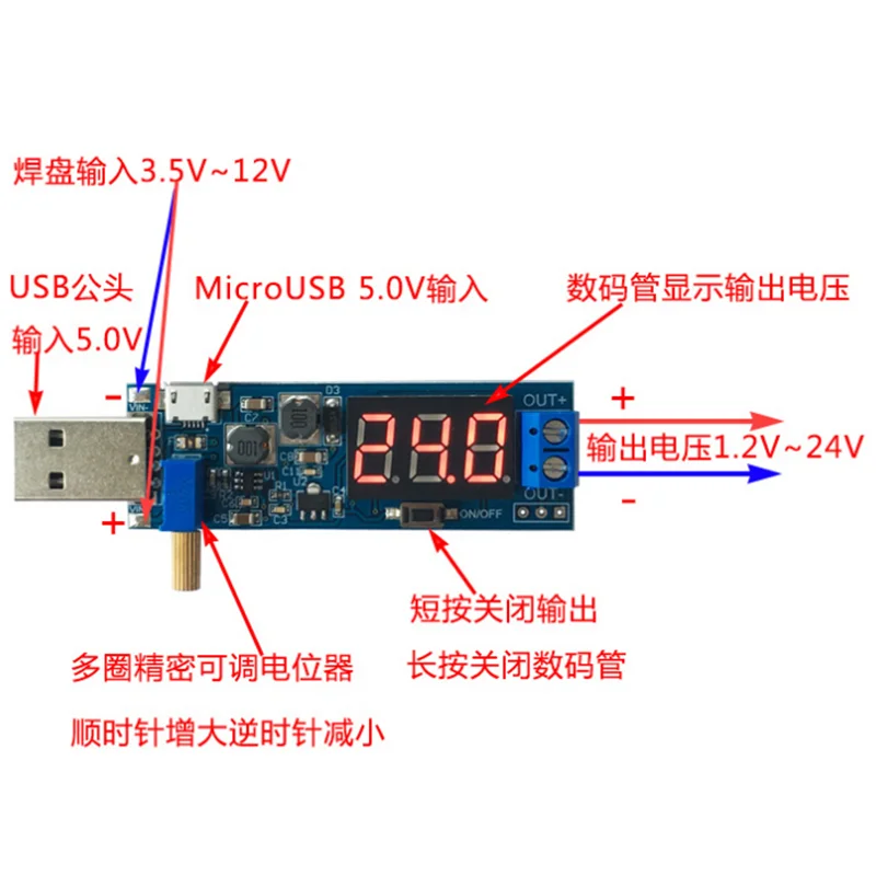 Convertidor Boost Buck USB, Módulo de Alimentación Elevador/Reductor de Voltaje DC-DC 5V a 3.3V / 12V, Salida Ajustable DC 1.2V-24V - TopDealBox