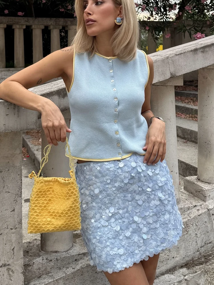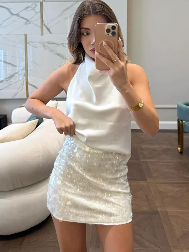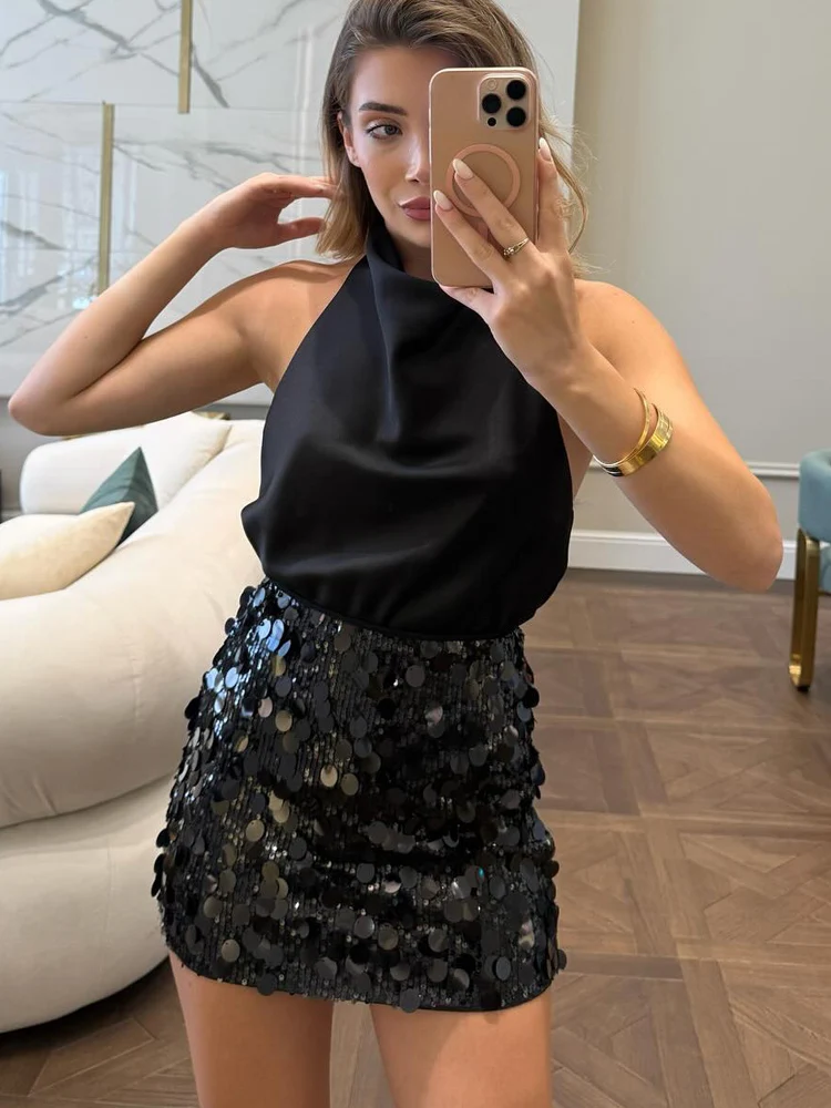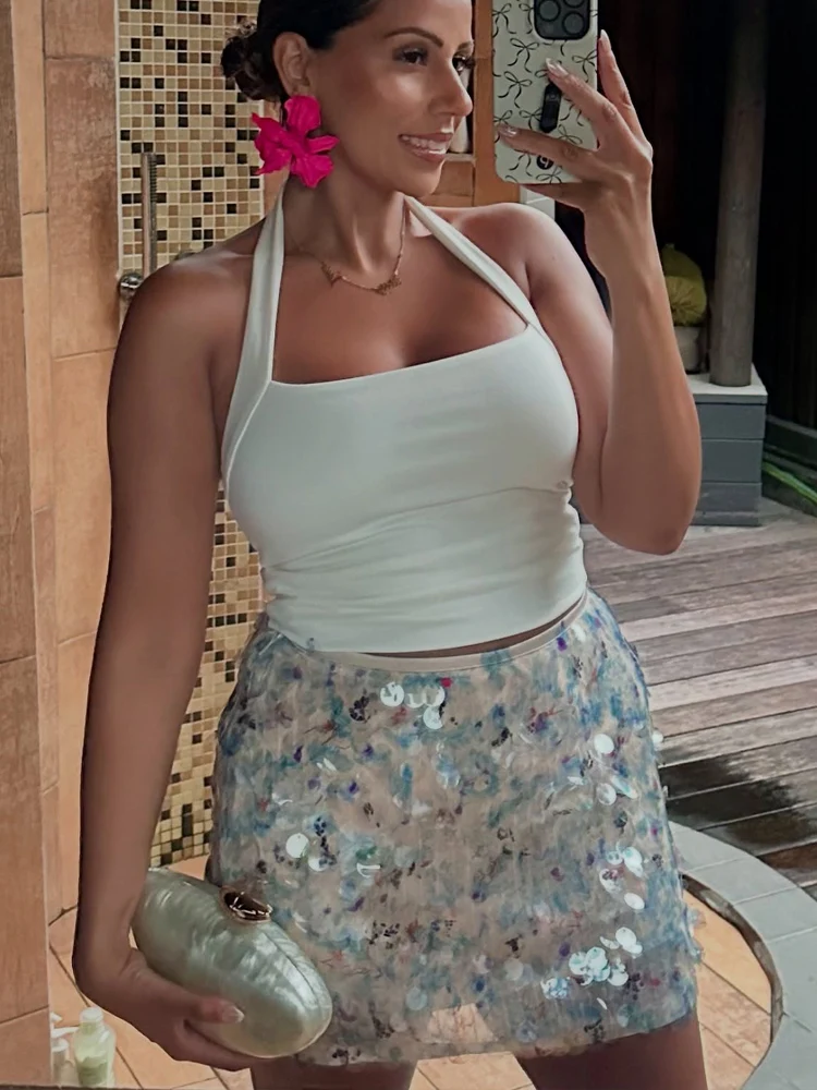 HH 우아한 여성용 솔리드 스팽글 슬림 미니 스커트 2025 반짝이는 파티 스타일 스커트 여성 섹시 하이웨이스트 숏 A라인 스커트